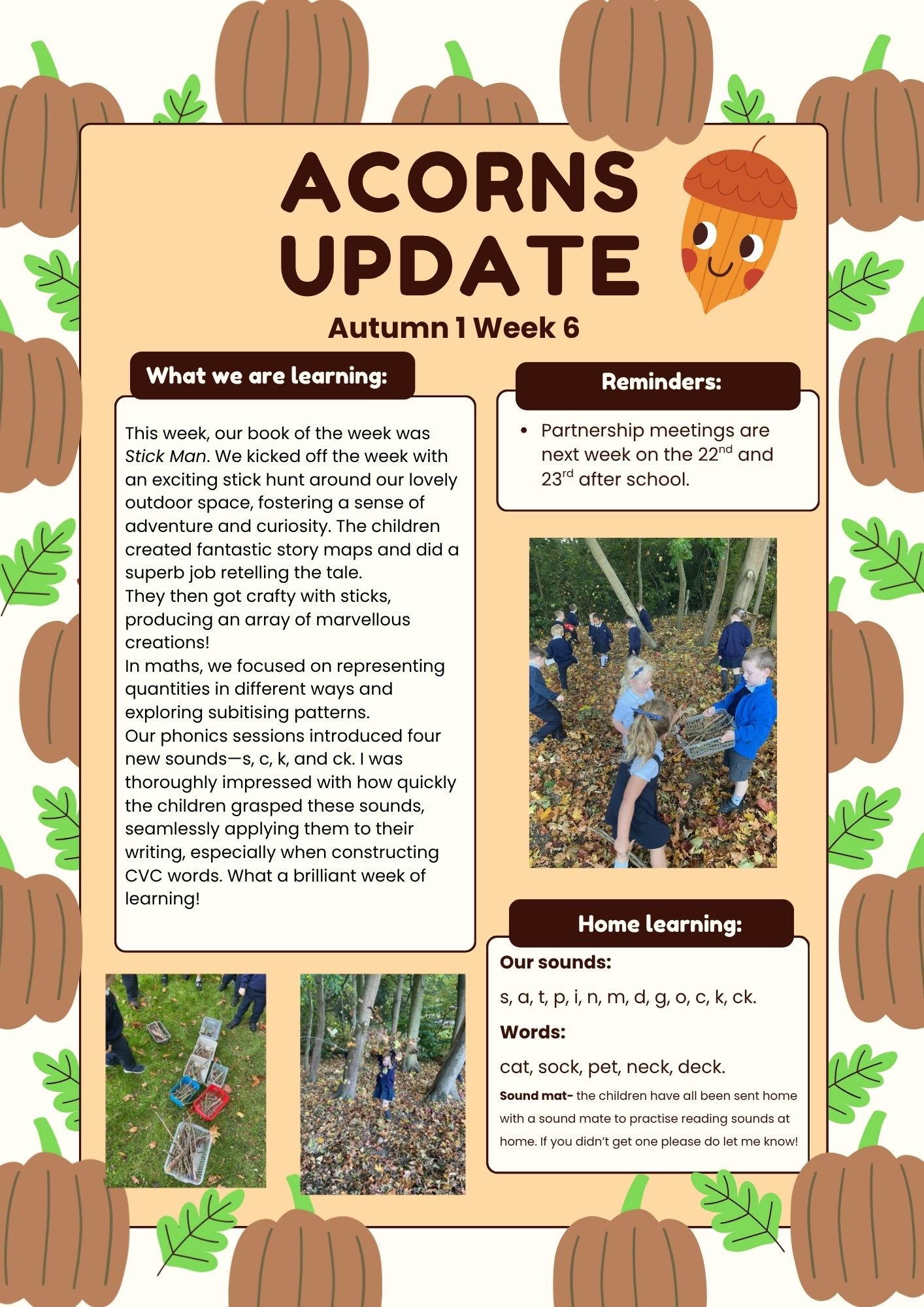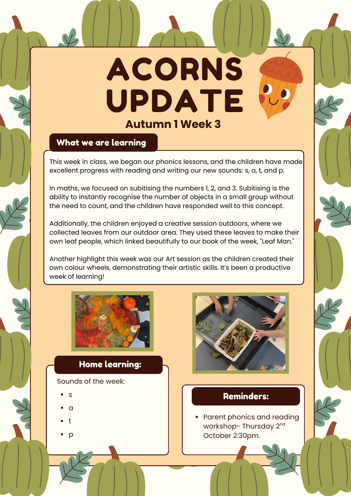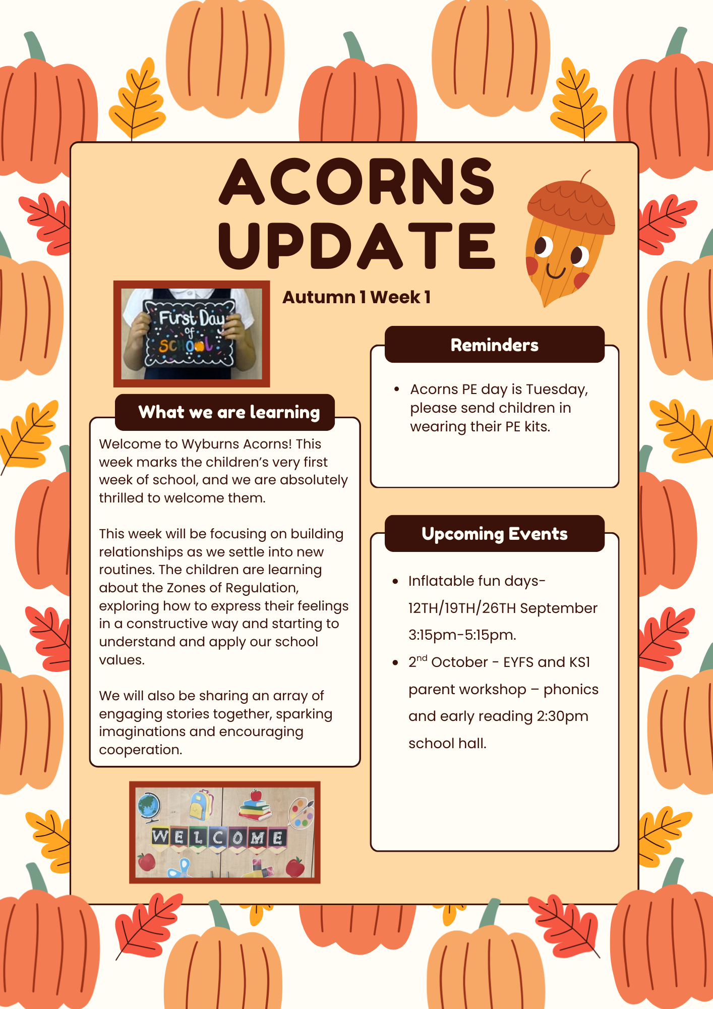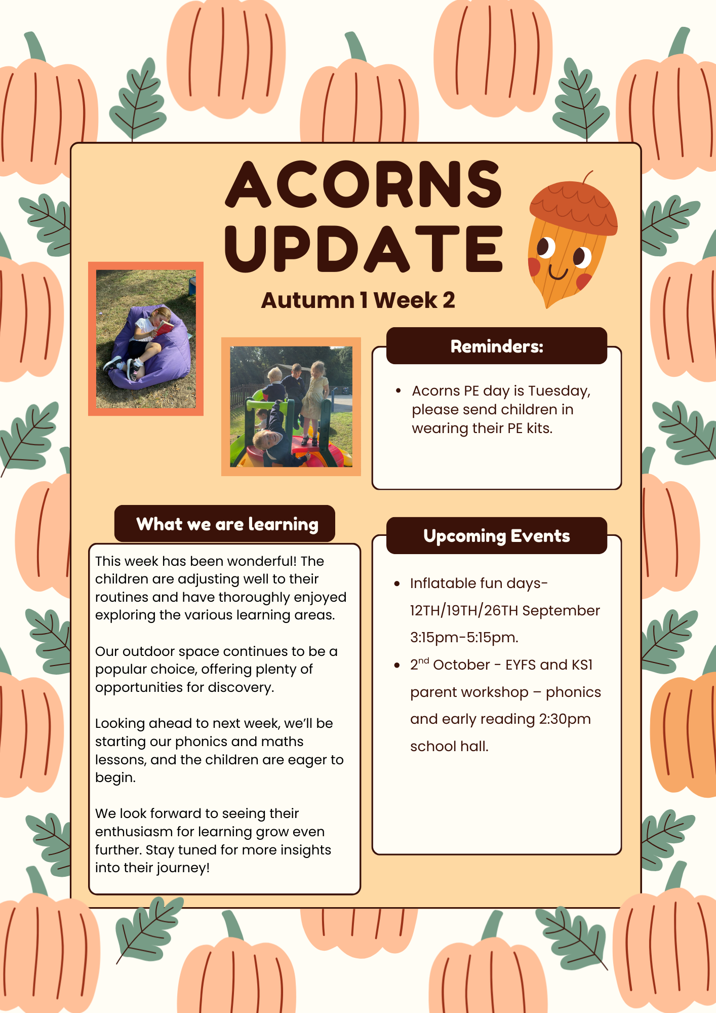 Hello and a big warm welcome to Acorns! We are absolutely thrilled to embark on this exciting journey of learning with you and your little ones during their first year in Reception.